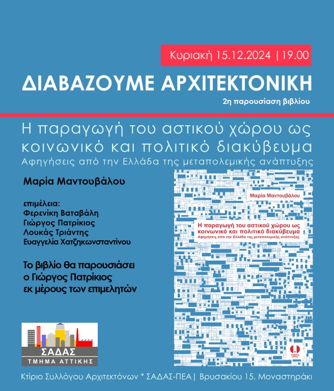 Με στόχο την ανάδειξη και προβολή της αρχιτεκτονικής τόσο στα μέλη του Συλλόγου όσο και στο ευρύ κοινό, το Τμήμα Αττικής του Συλλόγου Αρχιτεκτόνων (ΣΑΔΑΣ-ΠΕΑ) διοργανώνει μια σειρά παρουσιάσεων βιβλίων που σχετίζονται με την αρχιτεκτονική και σας καλεί στην 2η παρουσίαση του βιβλίου