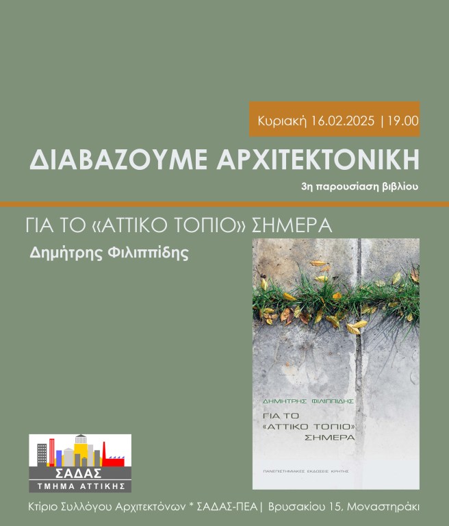 Κυριακή 16 Φεβρουαρίου 2025 στις 19.00 στο κτίριο του Συλλόγου Αρχιτεκτόνων / ΣΑΔΑΣ-ΠΕΑ / Βρυσακίου 15, Μοναστηράκι.