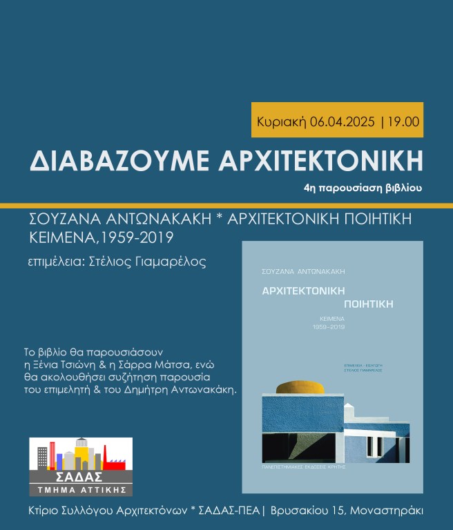 Κυριακή 6 Απριλίου 2025 στις 19.00 στο κτίριο του Συλλόγου Αρχιτεκτόνων / ΣΑΔΑΣ-ΠΕΑ / Βρυσακίου 15, Μοναστηράκι.