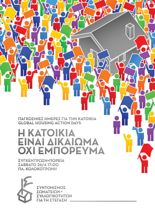 Ο Συντονισμός Σωματείων και Συλλογικοτήτων για τη Στέγαση, που ιδρύθηκε με πρωτοβουλία της Γενικής Συνέλευσης του ΣΑΔΑΣ Τμ. Αττικής, καλεί σε συγκέντρωση το Σάββατο 26 Απριλίου και ώρα 17:00 στο άγαλμα Κολοκοτρώνη και πορεία για το δικαίωμα στην κατοικία. Η κινητοποίηση γίνεται στο πλαίσιο των παγκόσμιων ημερών για την κατοικία (global housing action days).
